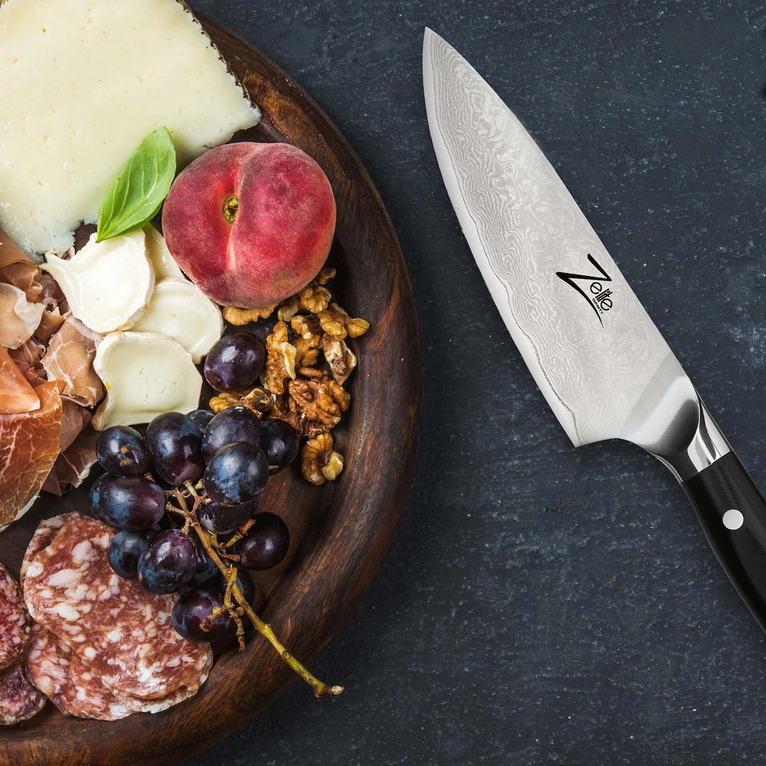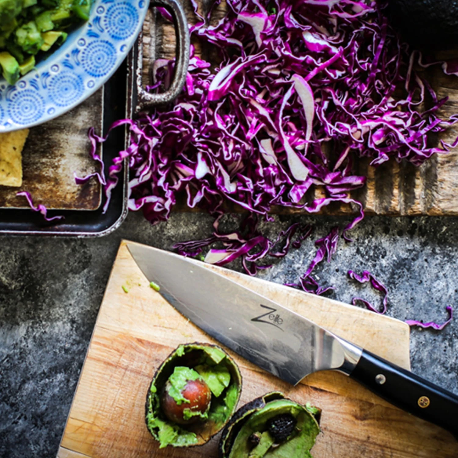 Das 6″ Chefkochmesser ist ein Hundertsassa der Alpha-Royal Japanese Serie von Zelite Infinity by Klarstein. Dank seiner Vielseitigkeit ist es ein geschätzter Generalist im täglichen kulinarischen Geschehen. Seine exklusive Charakteristik entsteht insbesondere durch den gebogenen Bauch, kombiniert mit einem glatten, konisch zulaufenden Kropf und einer ultrascharfen Spitze. So gelingt auch der unter Spitzenköchen so beliebte Kneifgriff mit schnellen, wippenden Schneidebewegungen. Aufgehoben mit der breiten Klinge landen geschnittene Zutaten schnell im Kochtopf, ohne am Messer zu kleben. Wie ein Chefkoch wirst du mit ihm Hacken, Schneiden oder Würfeln und dieses Kochmesser nicht mehr aus der Hand legen wollen!