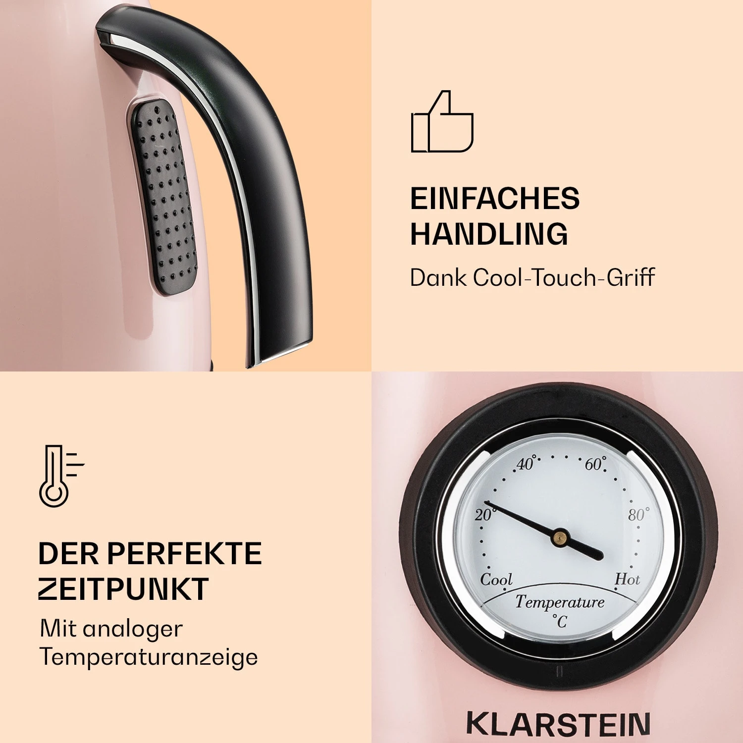 Der Klarstein Aquavita Chalet Wasserkocher bringt Wasser schnell und unkompliziert zum Kochen. Dank der seitlichen Temperaturanzeige kannst du den Siedeprozess in Echtzeit verfolgen und den idealen Zeitpunkt für die perfekte Aufgusstemperatur abpassen. Zusätzlich ist der Siedekocher mit einem Cool-Touch-Griff ausgestattet, das macht den Transport der heißen Ware von der Dockingstation zum Bestimmungsort besonders komfortabel.