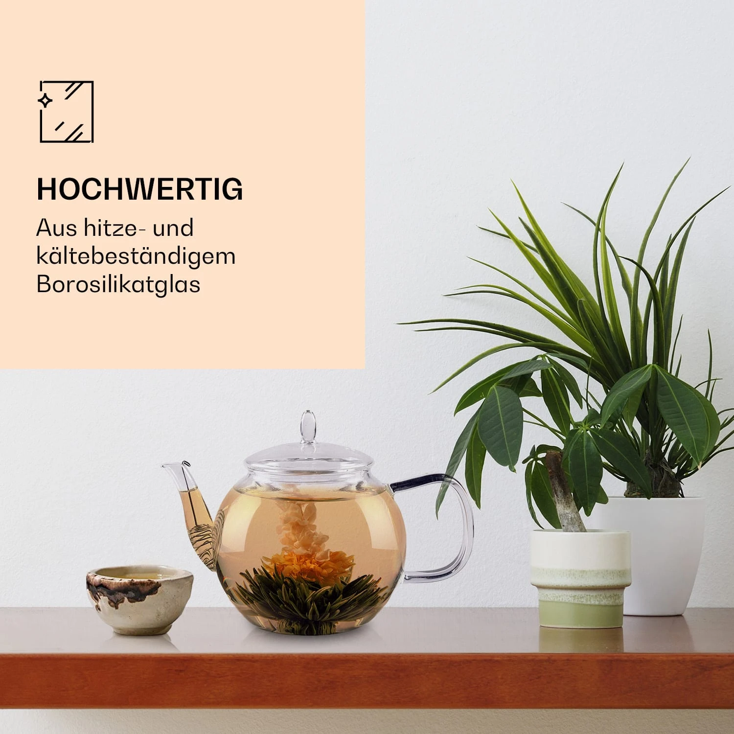 Teetrinken als Schauspiel der Natur: Die mundgeblasene Teekanne Bedida von Feelino by Klarstein zeigt durch ihren bauchige Glasschicht wundervoll, wie sich exotische Teeblumen unter Wasser farbenprächtig entfalten.