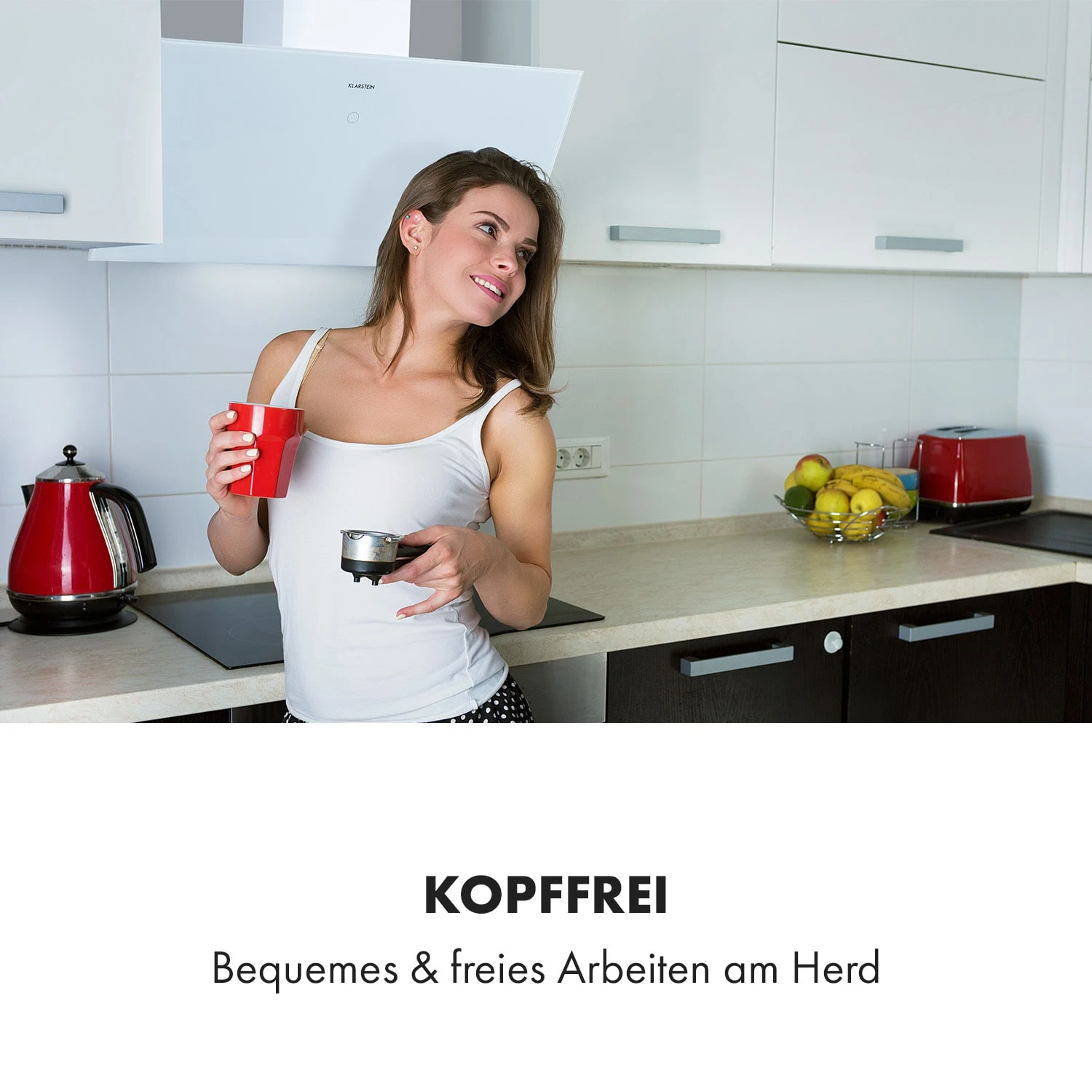 Die Klarstein Laurel 90 Dunstabzugshaube sorgt mit 65 W Motorleistung im Umluftbetrieb für dunstfreie Luft in kleinen bis mittleren Küchen. Drei Leistungsstufen liefern bis zu 350 m³ Abluftleistung in der Stunde und passen die Wandabzugshaube dem jeweiligen Kochaufkommen gezielt an. Der Dampf wird dabei durch krafvolle Edge Performance mit Randabsaugung eingesogen, die edle Glasfront bleibt während des Betriebs geschlossen. Besonders praktisch ist die nach oben aufstrebende Konstruktion der 90 cm breiten Kopffrei-Haube, die dem Kopf die nötige Bewegungsfreiheit beim Kochen verleiht. Dabei benötigt die Ablufthaube in der Tiefe kaum Platz. Per frontseitiger Bediensektion werden Lüftung und Beleuchtung angesteuert. Ein Abschalttimer lüftet unkompliziert für 1 bis 9 Minuten nach und schaltet das Gerät danach ab. Gesteuert wird die edle Haube ganz unkompliziert über das integrierte Touch-Bedienfeld mit Digital-Anzeige. Ein zuschaltbares Licht mit 2 x 1,5 W LED-Lampen sorgt für gute Sichtverhältnisse am Herd.