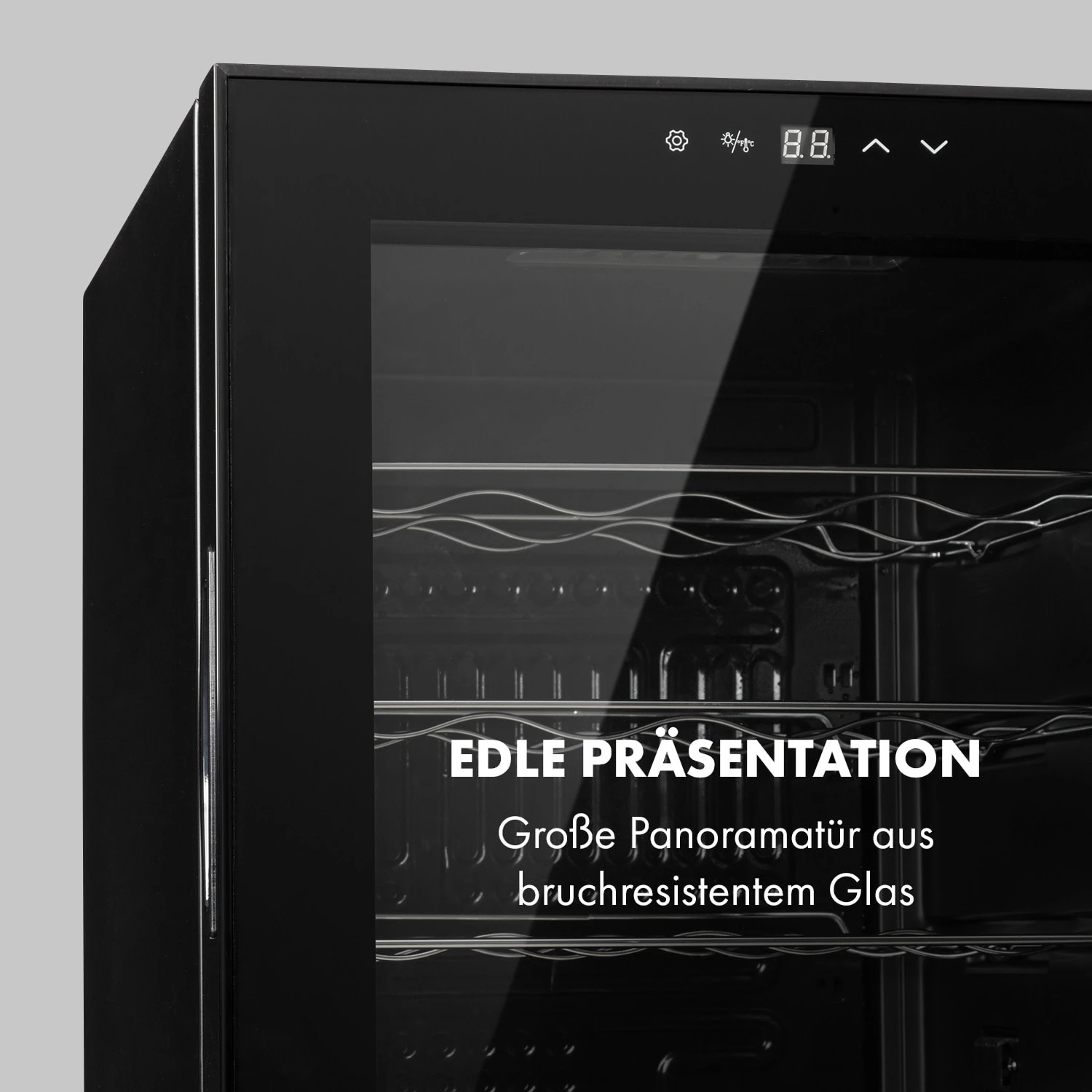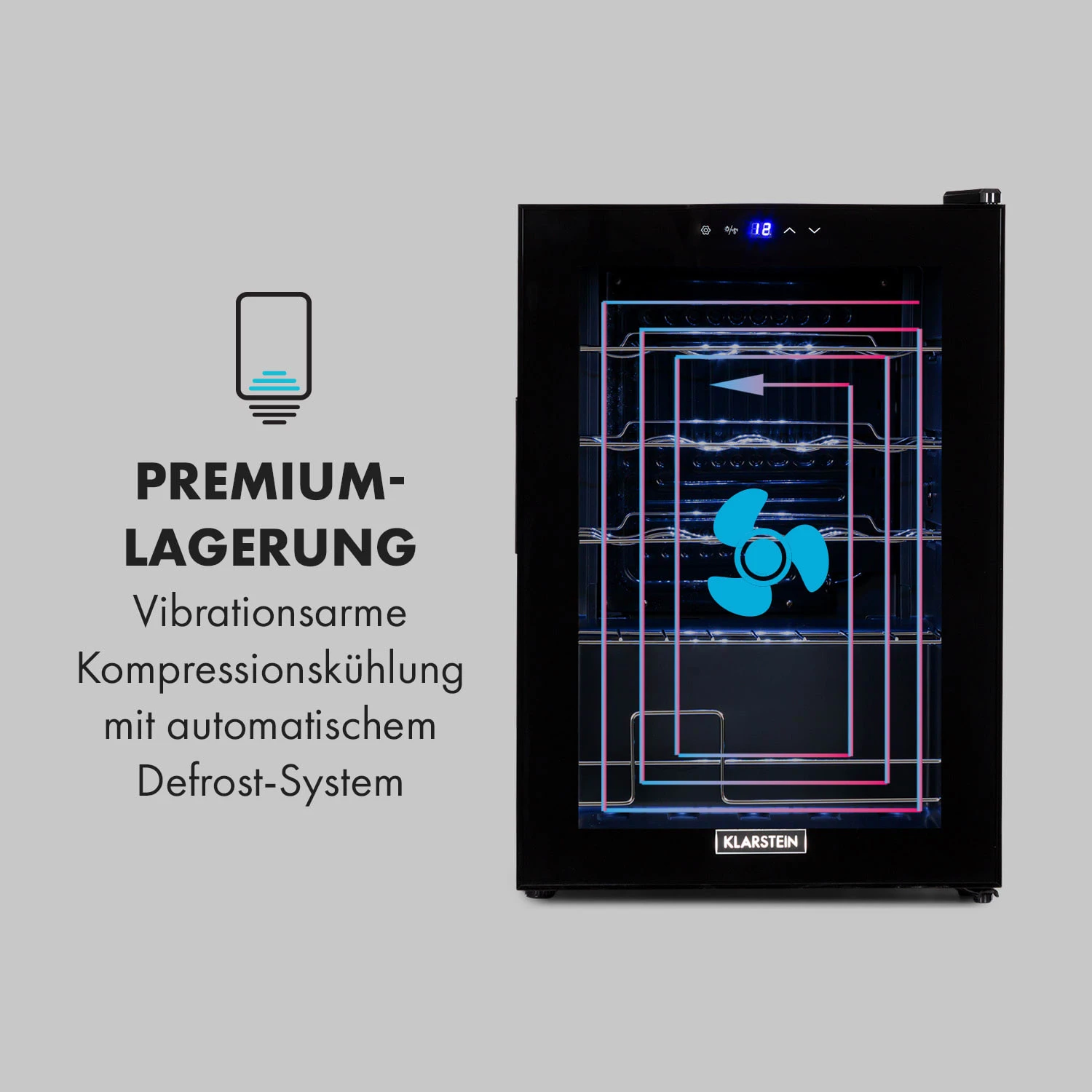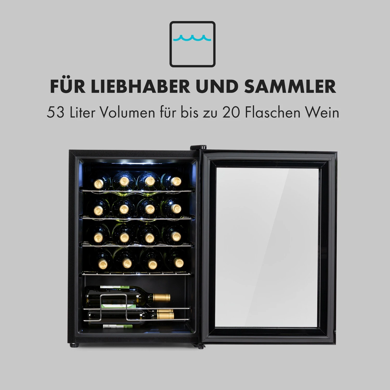 Aus Liebe zum Wein: Der Klarstein Shiraz 20 Slim Uno Weinkühlschrank sorgt für besten Weingenuss, indem er Weinflaschen die richtige Trinktemperatur verschafft. Dabei glänzt er mit seinem Slim-Design und schmiegt sich auch in kleine Lücken wundervoll ein. Bis zu 20 Flaschen Wein kannst du mit ihm optimal lagern und auf eine Trinktemperatur zwischen 5 und 18 °C kühlen. Die Fronttür aus Sicherheitsglas ermöglicht dir dabei eine wundervolle Präsentation der edlen Flaschen.