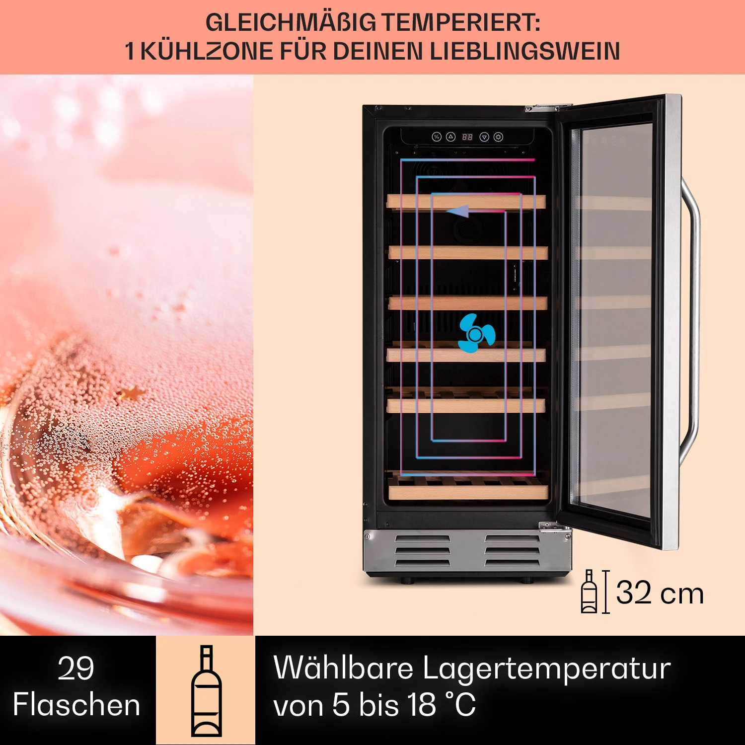 Edles Design und smart im Verbrauch: Der Klarstein Vinovilla 29 Built-In Uno Weinkühlschrank ist ein praktischer Weinlagerschrank, der durch seine moderne Glastür mit Seamless Edelstahlfront jede Wohnlandschaft und Küchenzeile bereichert – Willkommen in der Profiliga der Weinlagerung! Bis zu 29 Flaschen finden auf den sechs Lagerregalen aus Holz Platz und können bei 5 – 18 °C gekühlt werden. Ein integrierter Aktivkohle-Filter ermöglicht eine geruchslose, langfristige Lagerung.