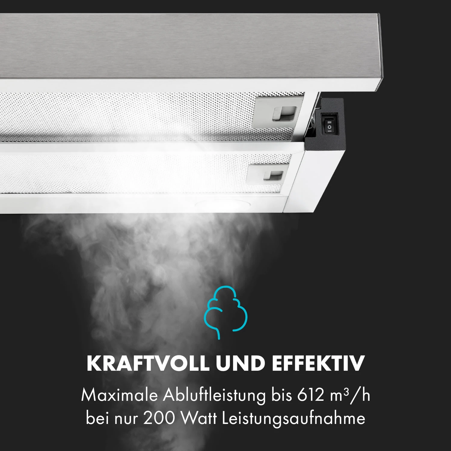 Mit zwei Leistungsstufen kann ihre Arbeitsleistung unkompliziert an das Kochgeschehen angepasst werden. Auf höchster Leistungsstufe befördert sie bis zu 612 m³/h Abluft aus deiner Küche. Zwei zuschaltbare LED-Kochflächenlampen ermöglichen jederzeit den ungetrübten Blick in deine Pfannen und Töpfe.
